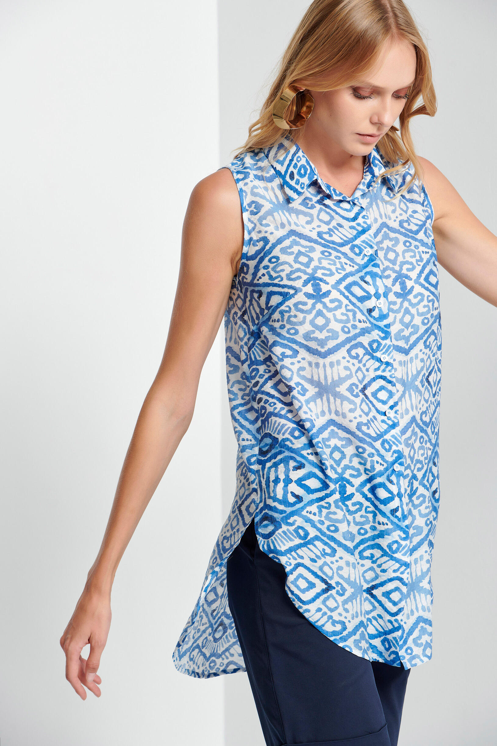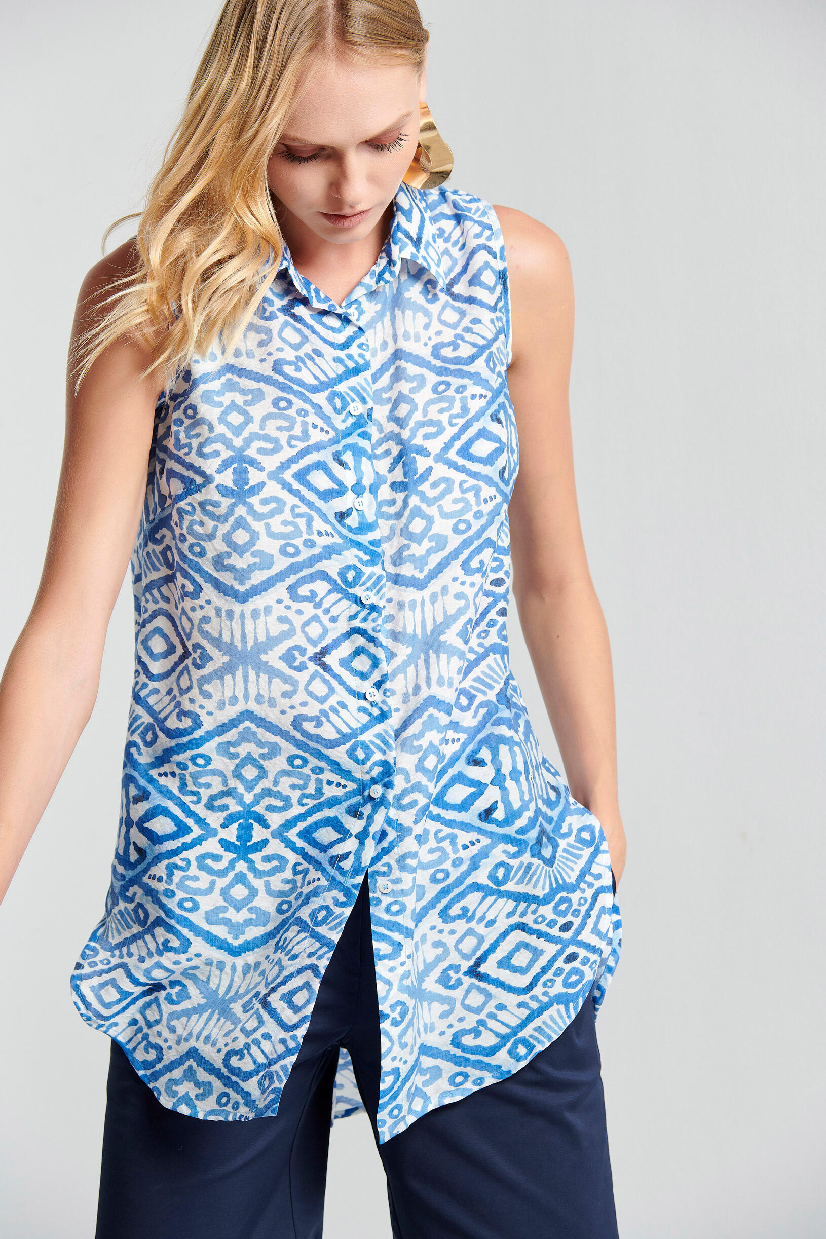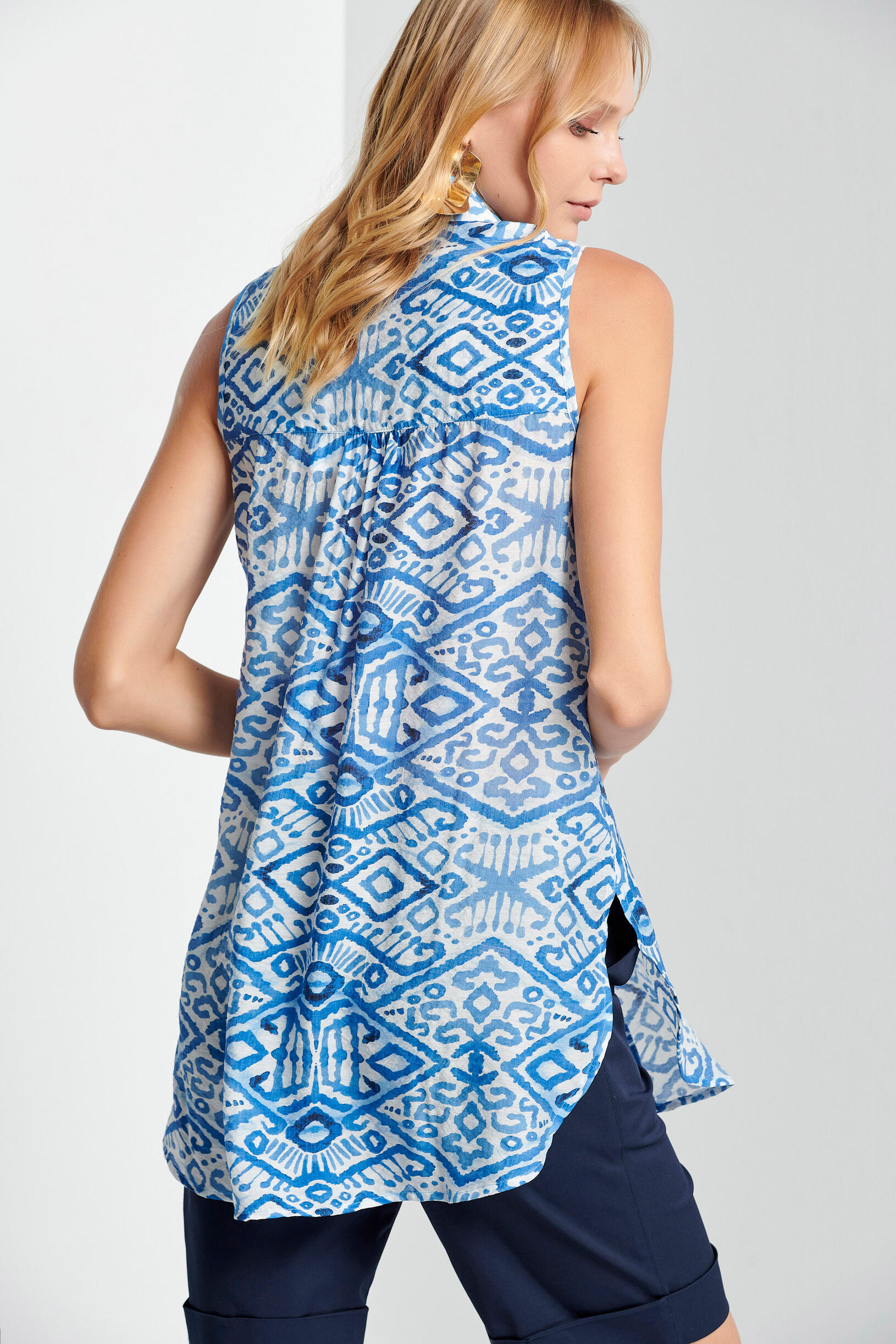 Αμάνικο πουκάμισο Κωδικός 10-341842-0 Περιγραφή Πουκάμισο με πέτο γιακά,κουμπιά μπροστά και πλαϊνά ανοίγματα. Σύνθεση 85% rayon 15% polyester