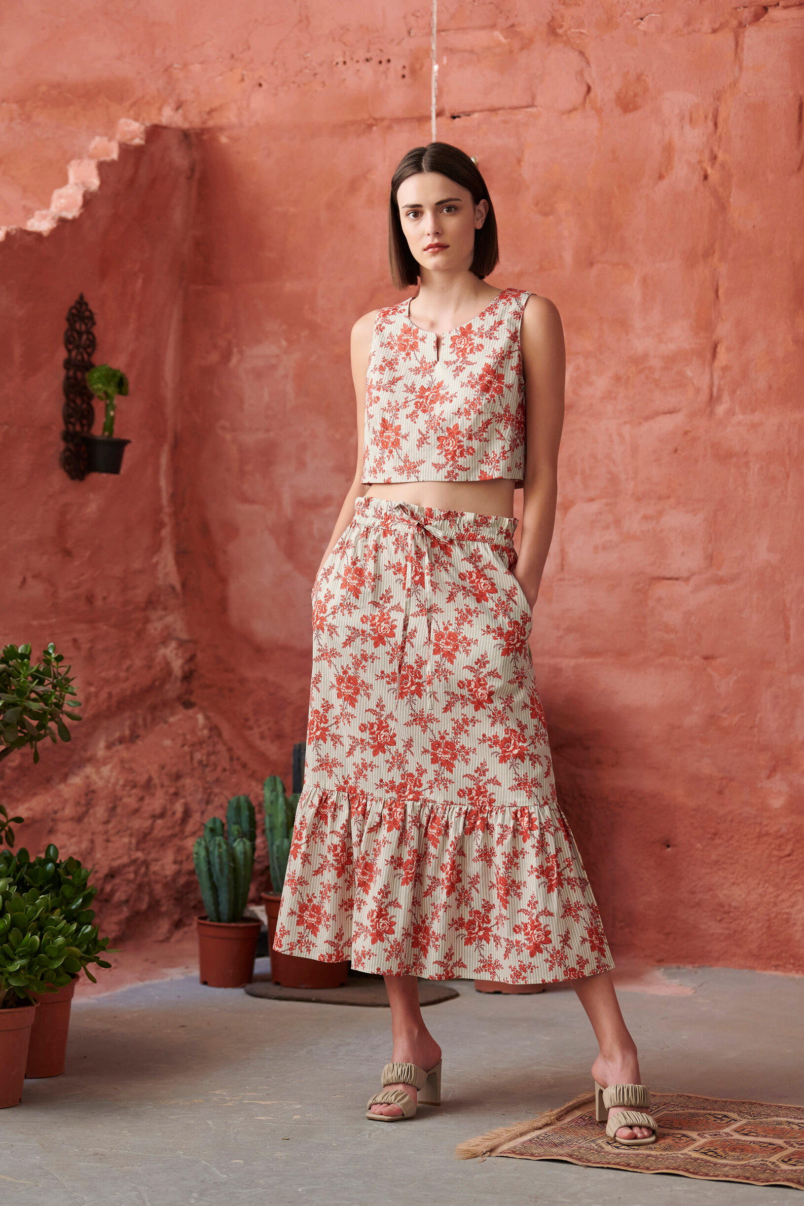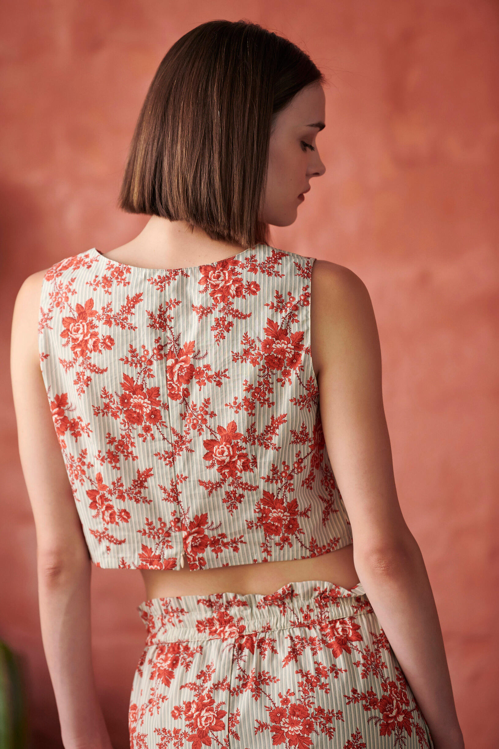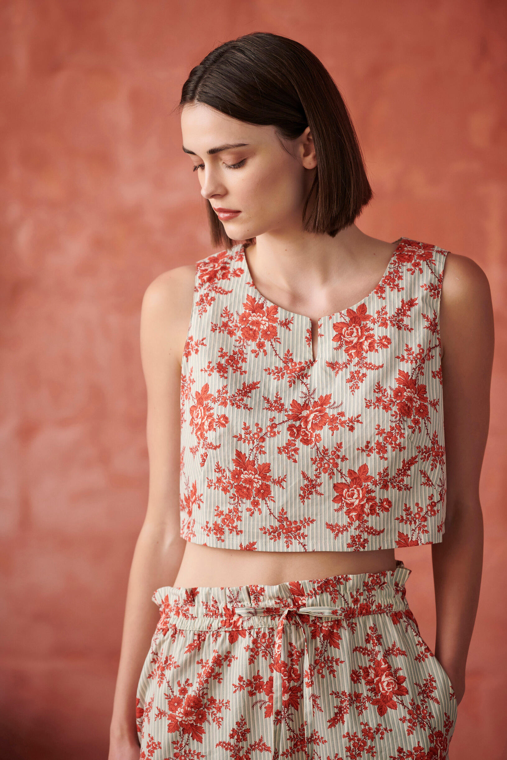 Μπλούζα αμάνικη Κωδικός 10-341634-0 Περιγραφή Αμάνικη επριμέ μπλούζα, κλείσιμο με φερμουάρ στην πλάτη.Μπορεί να συνδυαστεί με τη φούστα 10-341633-0. Σύνθεση 100% cotton