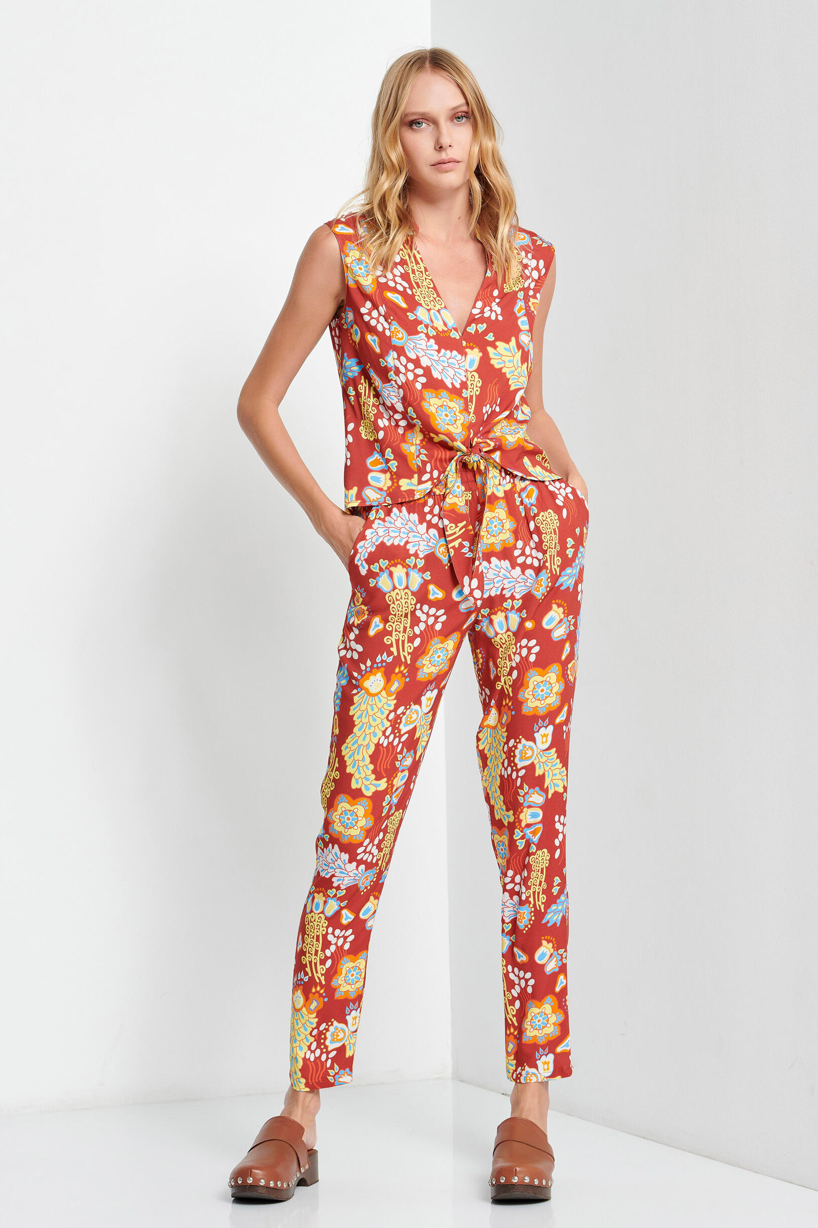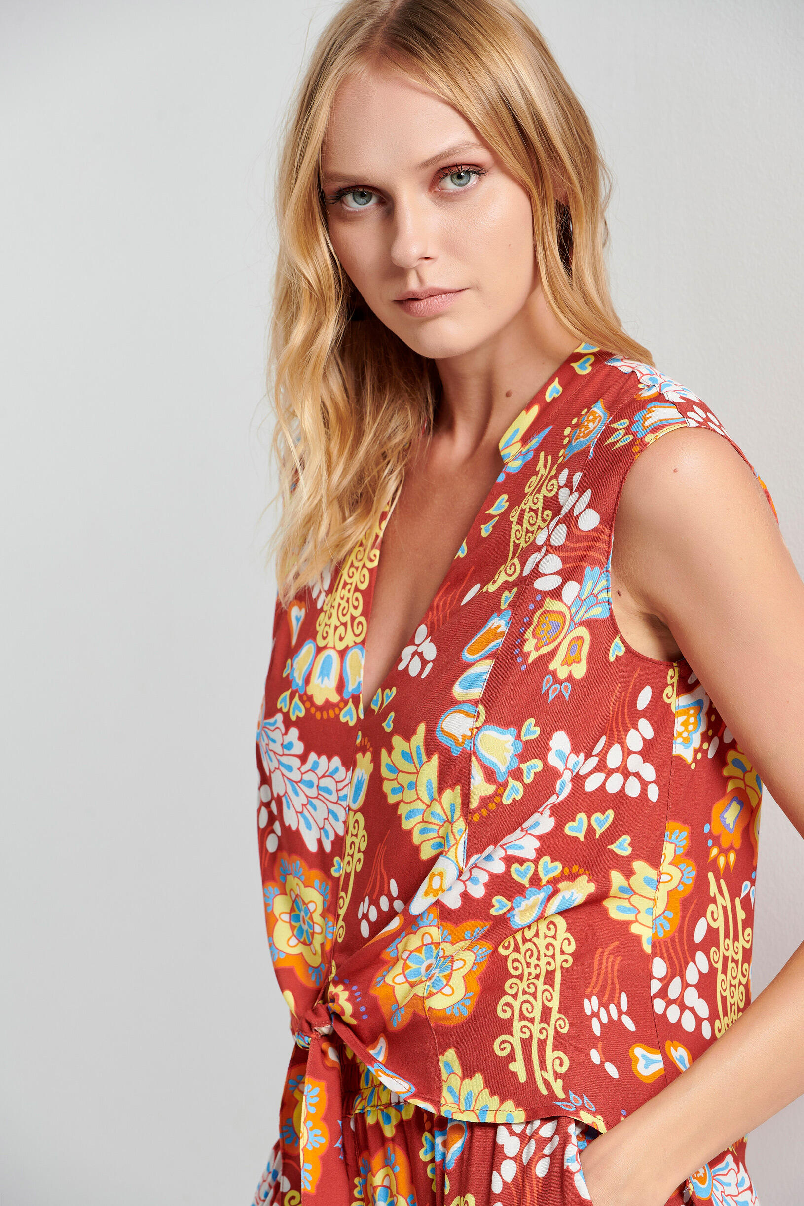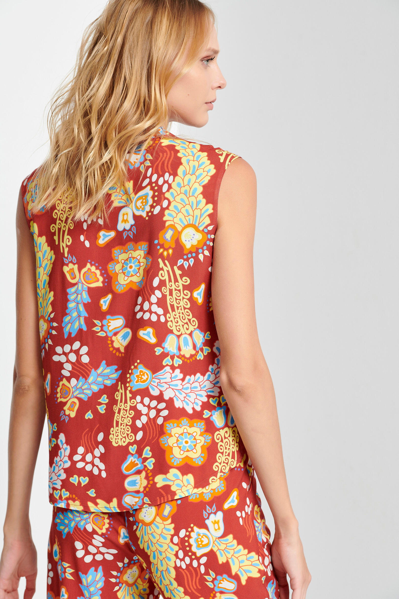 Εμπριμέ μπλούζα με μαο γιακά και λαιμόκοψη σε σχήμα V.Συνδυάστε τη με το παντελόνι ίδιου print 10-341807-0 για ένα summer outfit.