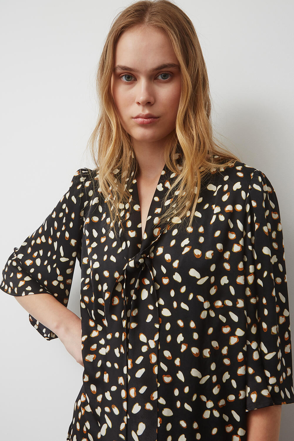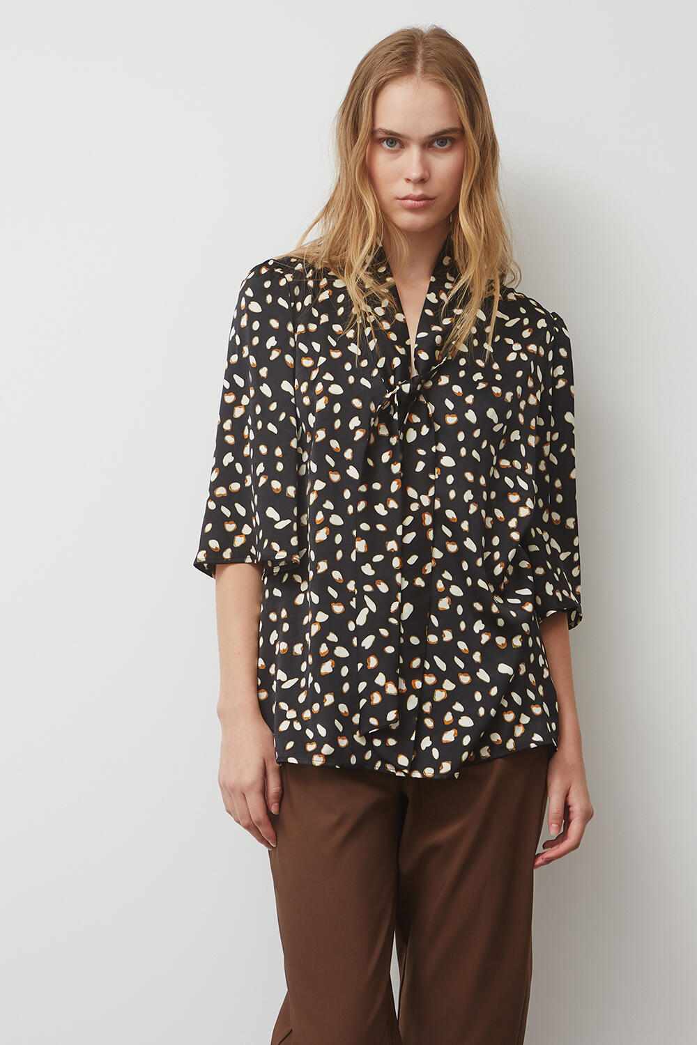 Μπλούζα σατέν με αποσπώμενη ζώνη Κωδικός 10-342055-0 Περιγραφή Μπλούζα σατινέ εμπριμέ με αποσπώμενη ζώνη και V ντεκολτέ μπροστά. Η ζώνη μπορεί να φορεθεί και ως φουλάρι. Σύνθεση 97% cotton 3% spandex