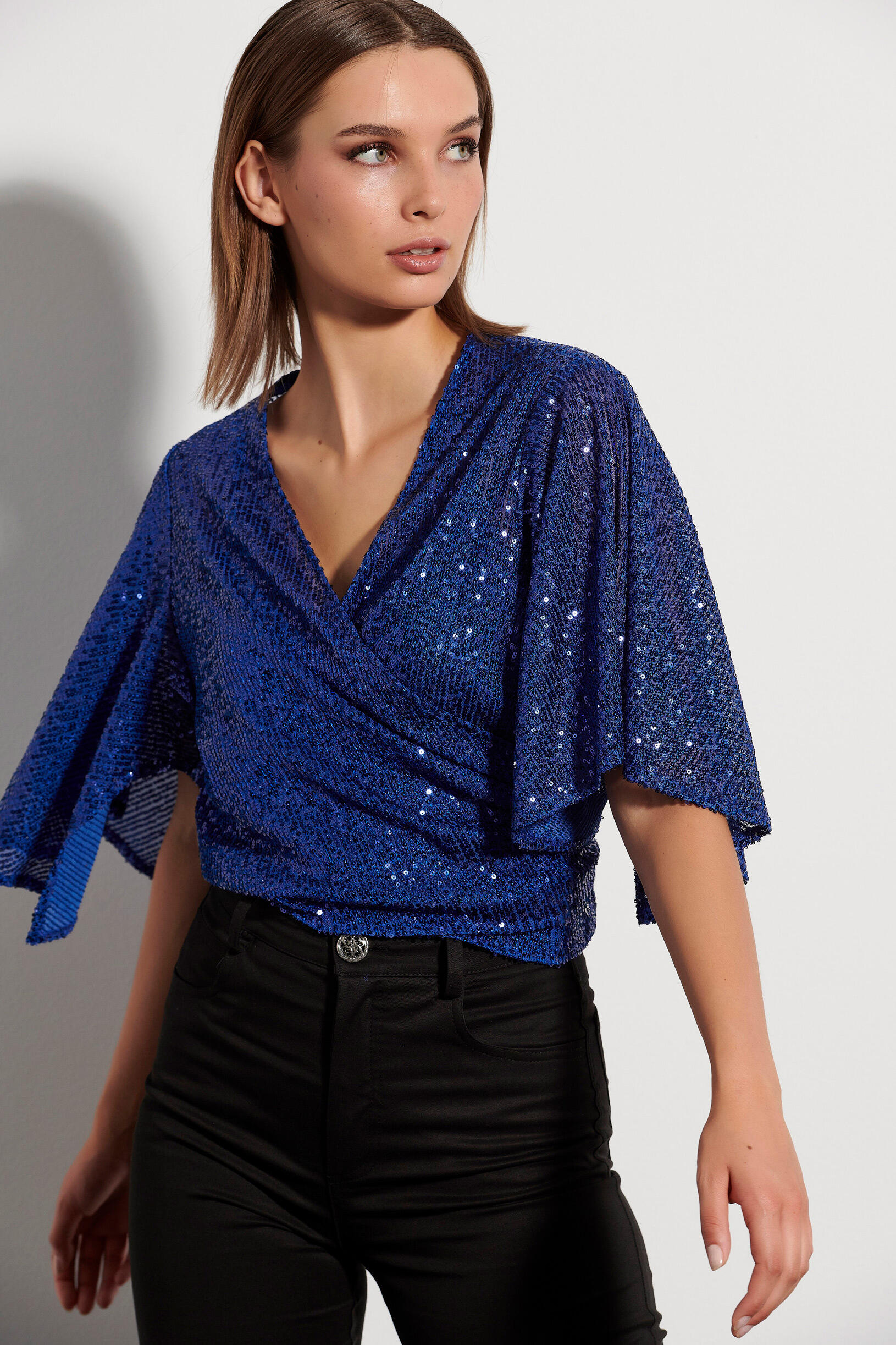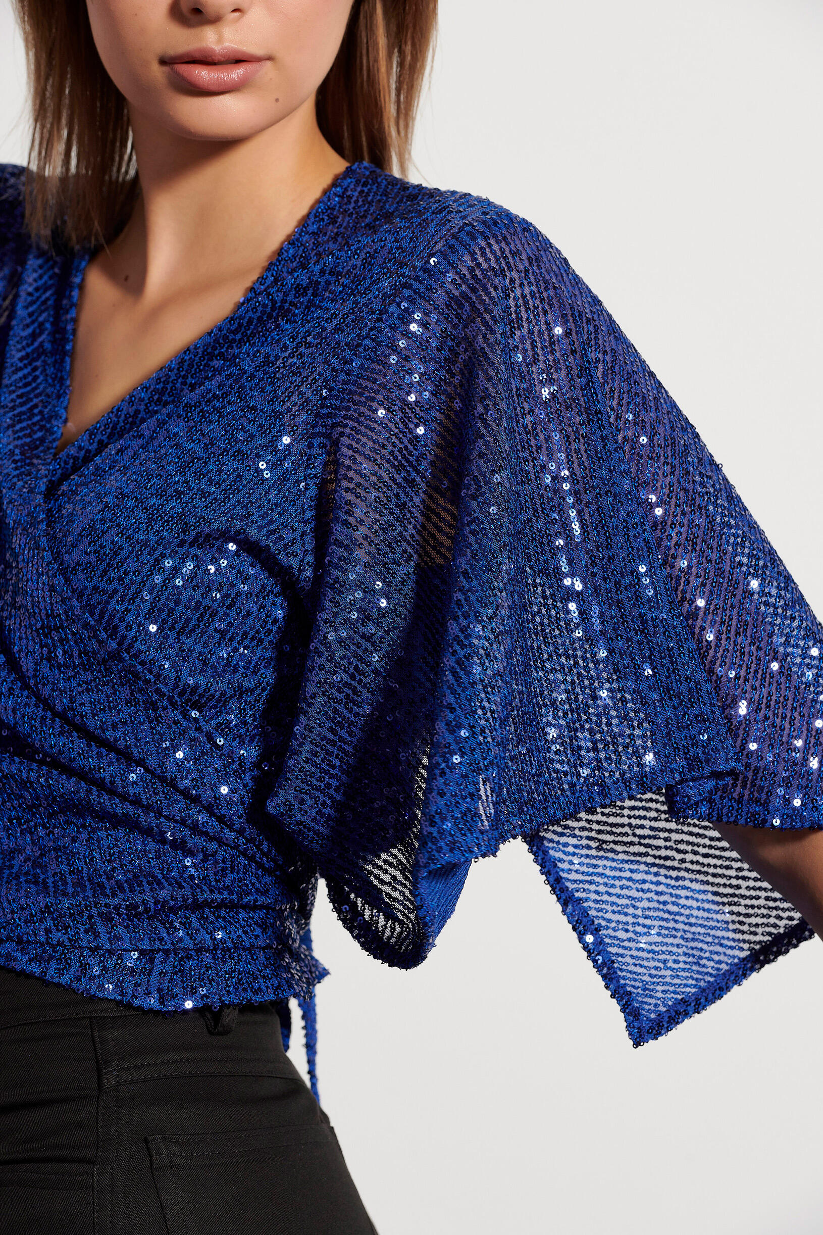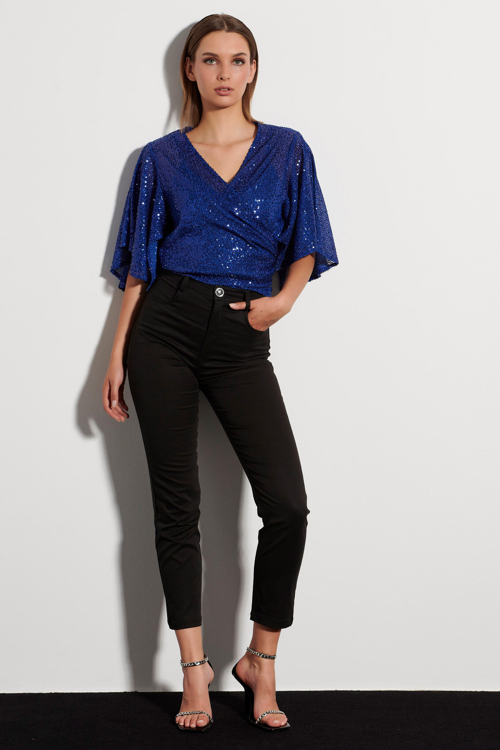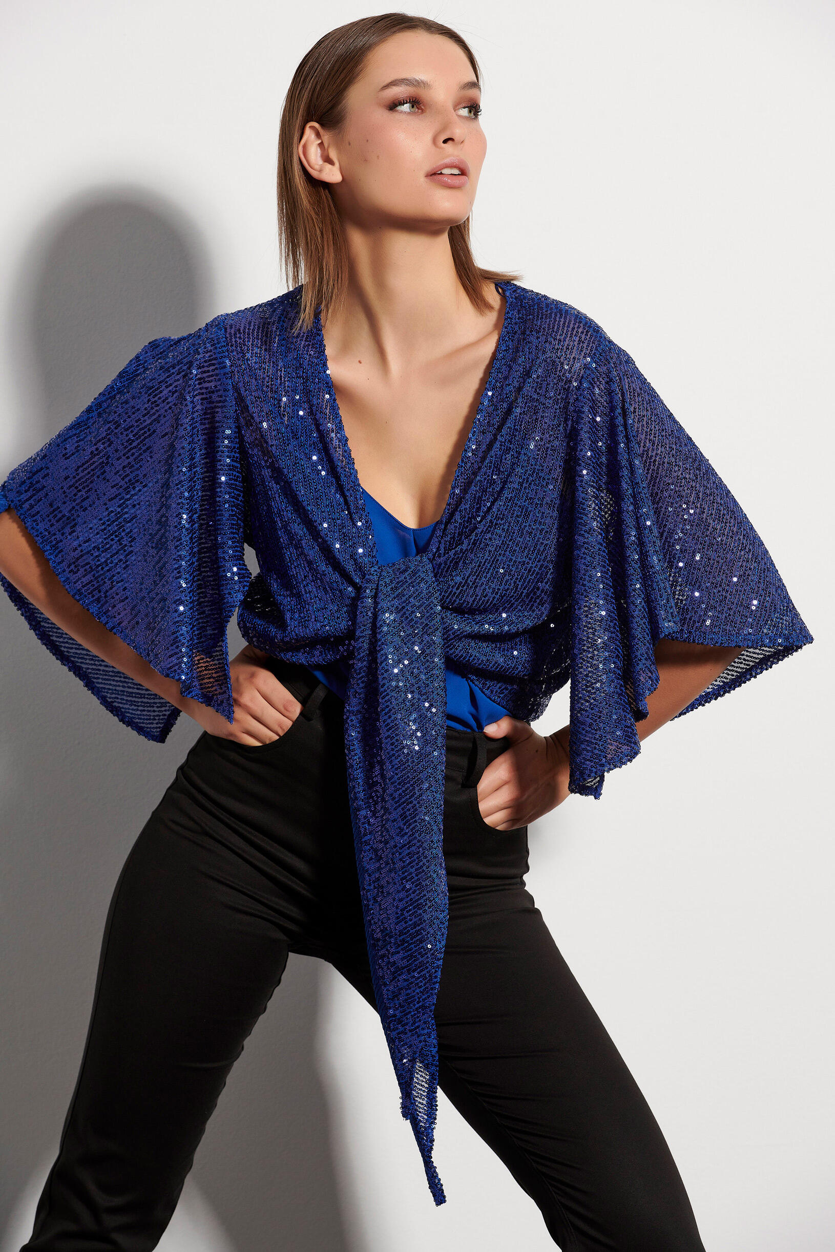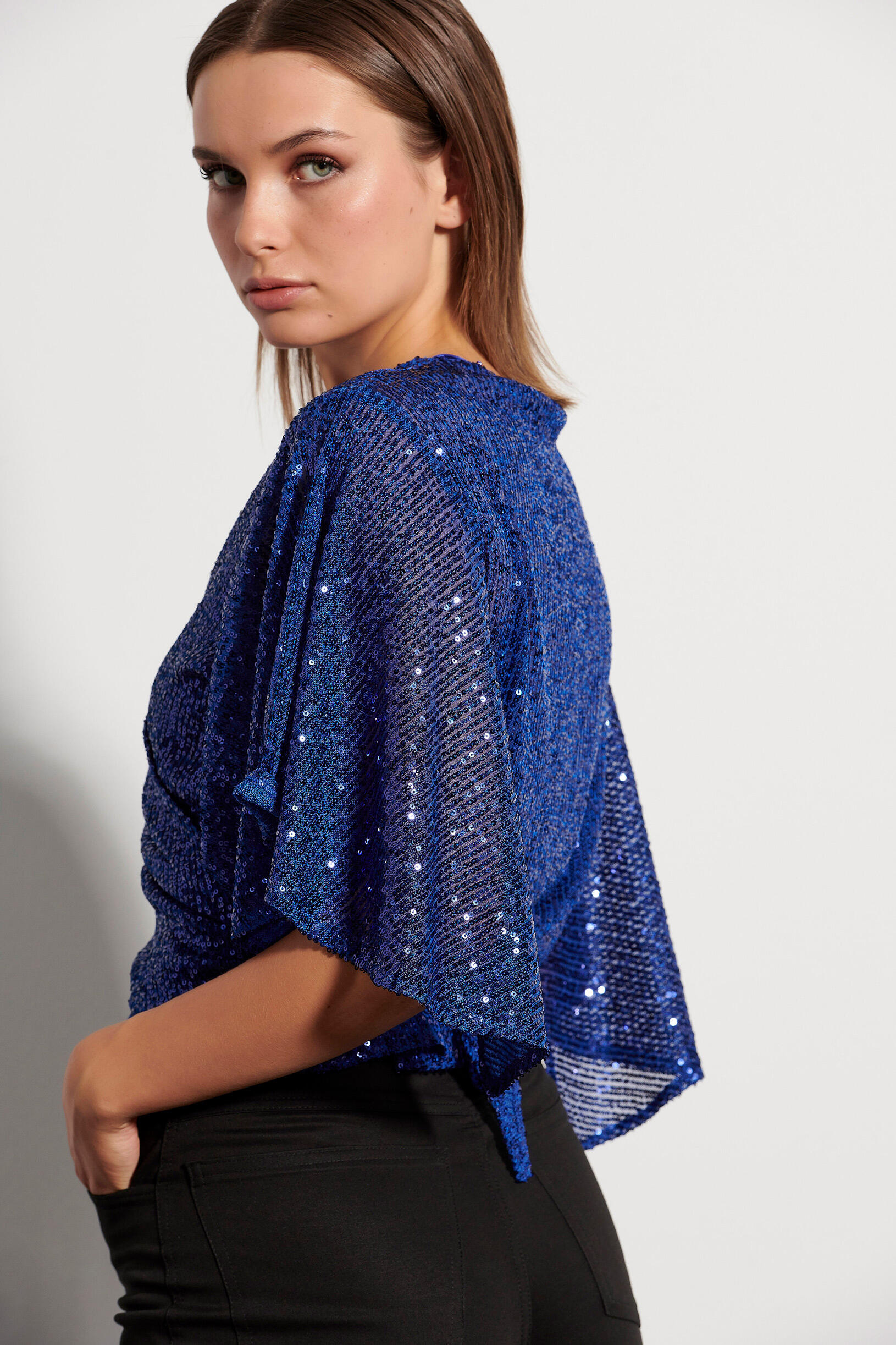 Μπολερό με παγιέτες που κλείνει μπροστά με δέσιμο, και τελείωμα με βολάν στα μανίκια. Συνδυάστε το με τη 10-370052-0 παντελόνα για ένα εντυπωσιακό look.