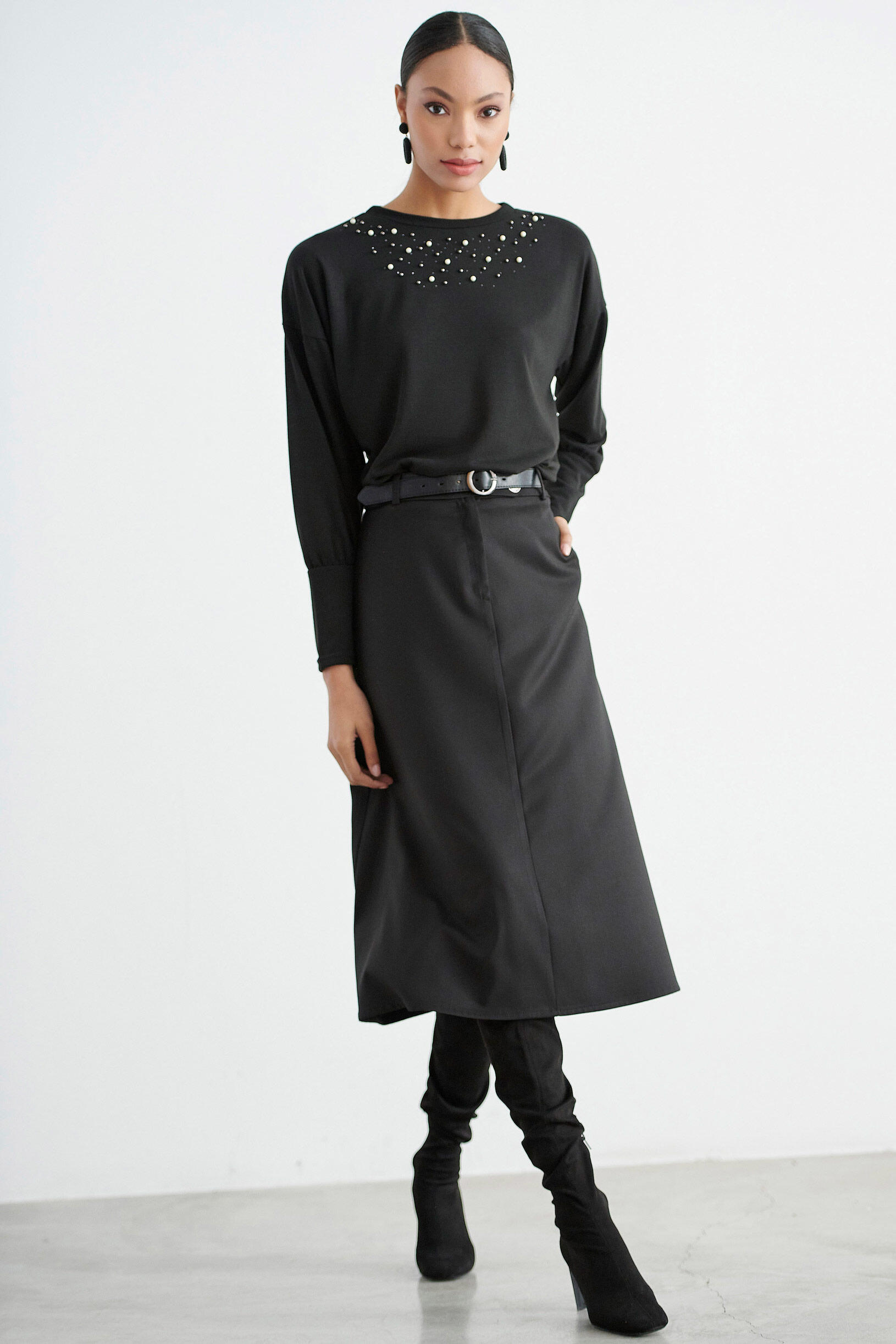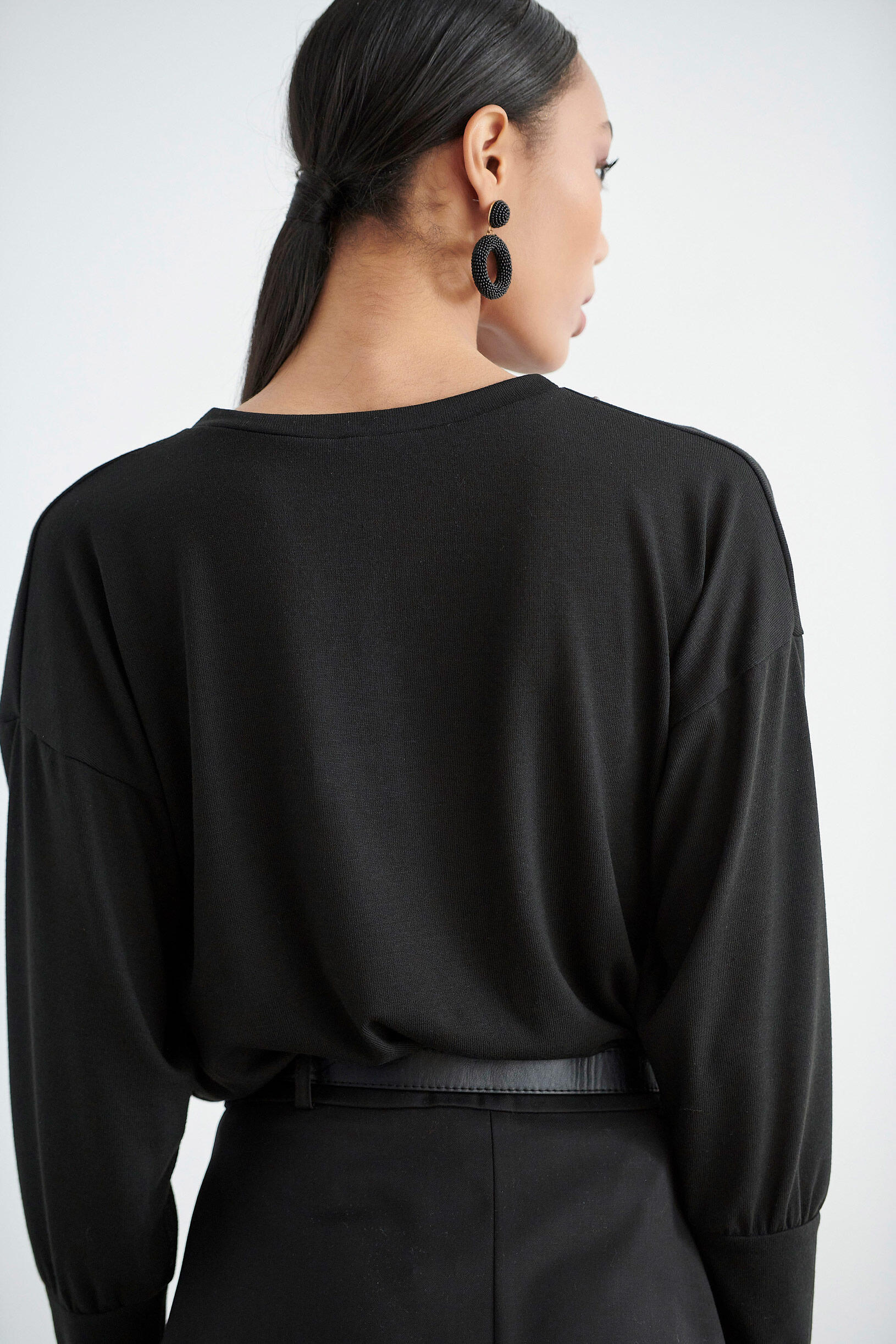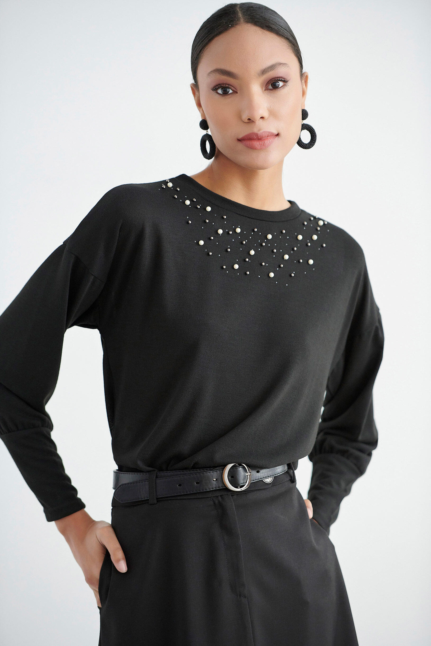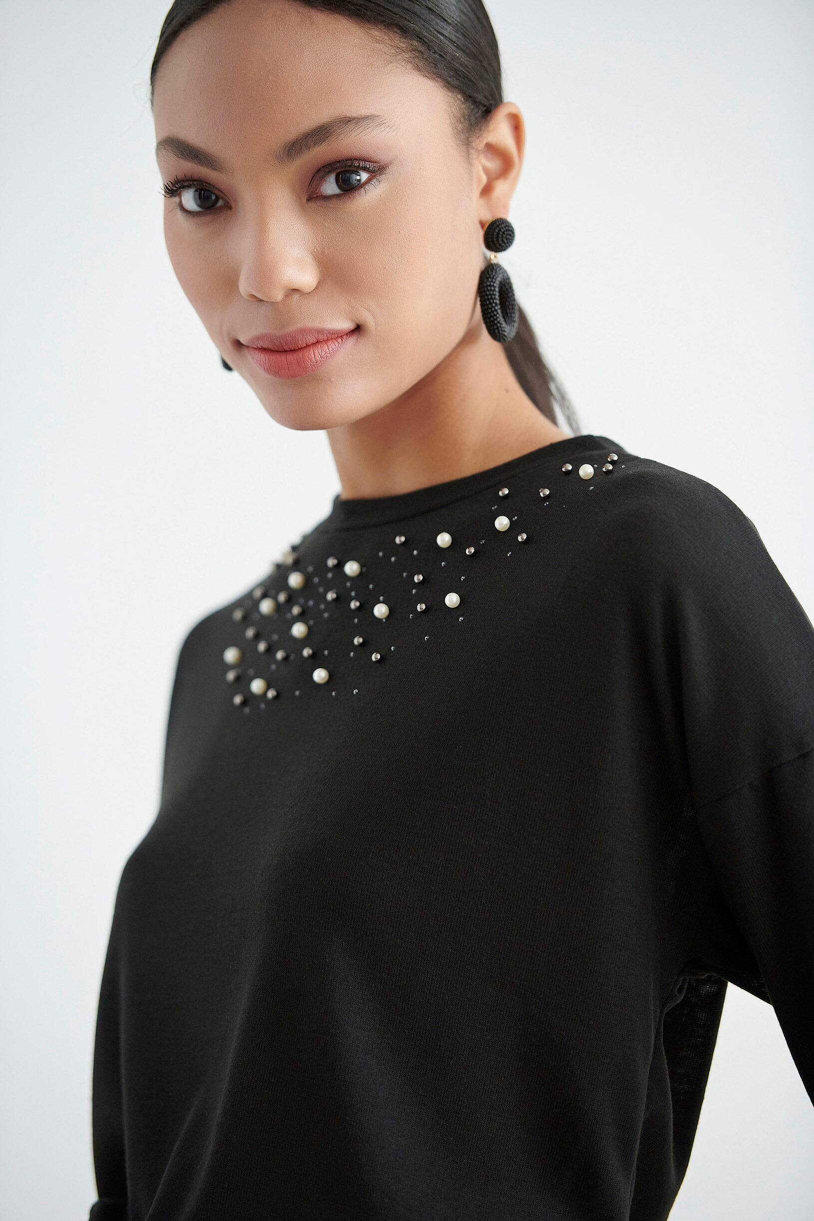 Μακρυμάνικη πλεκτή μπλούζα με στρογγυλή λαιμόκοψη. Διαθέτει πέρλες μπροστά και φαρδιές μανσέτες. Ευκολοσυνδύαστο κομμάτι για όλη την ημέρα.