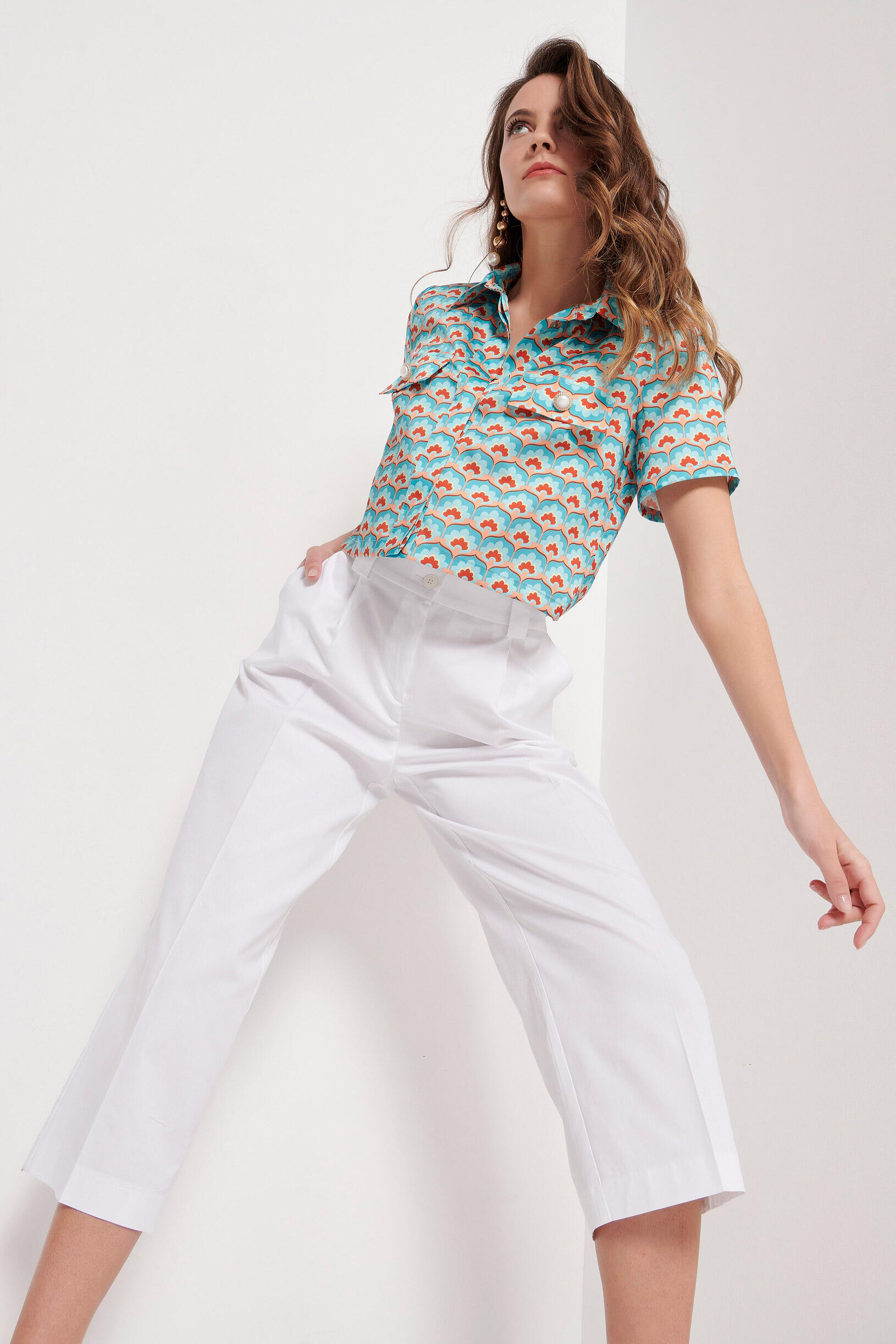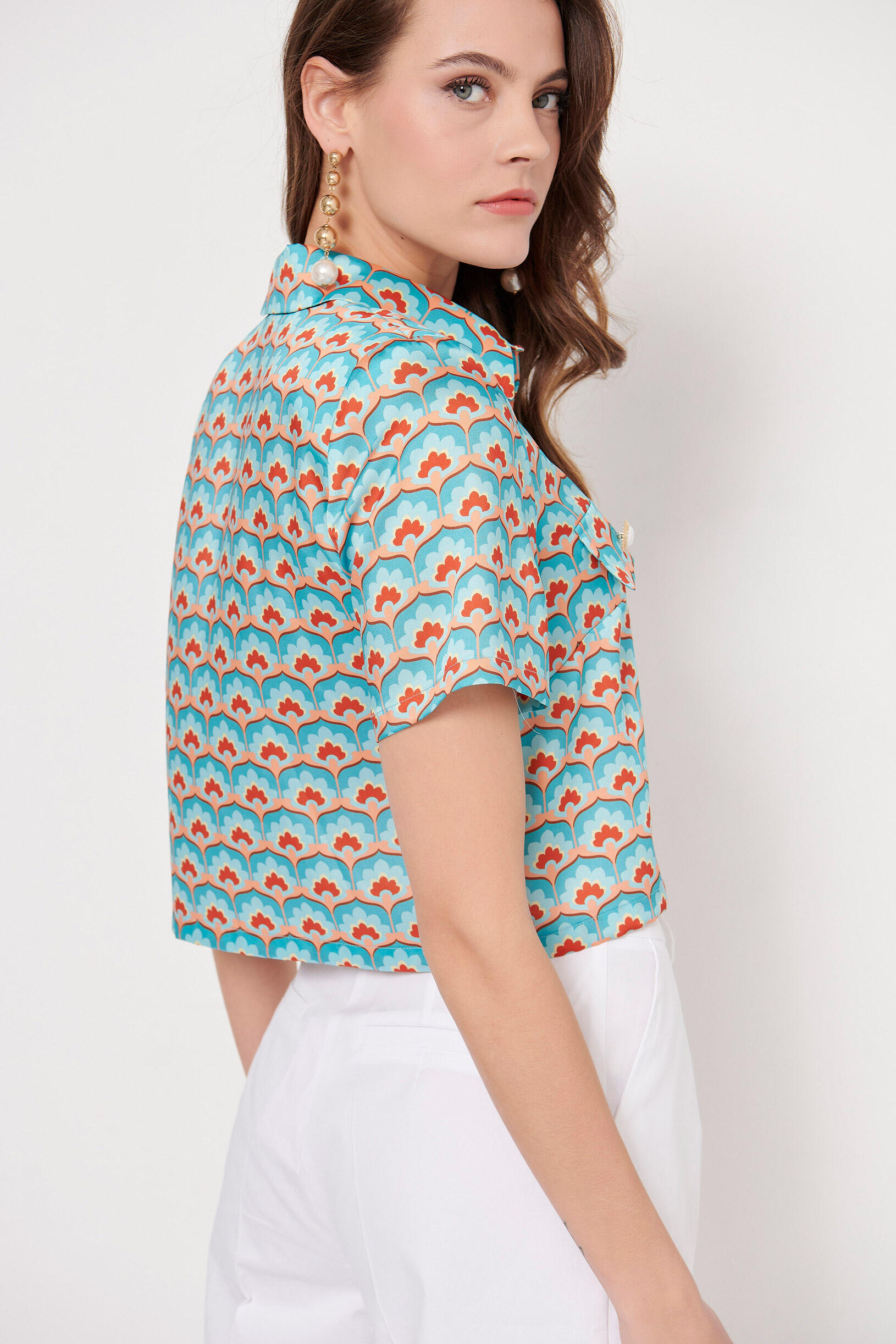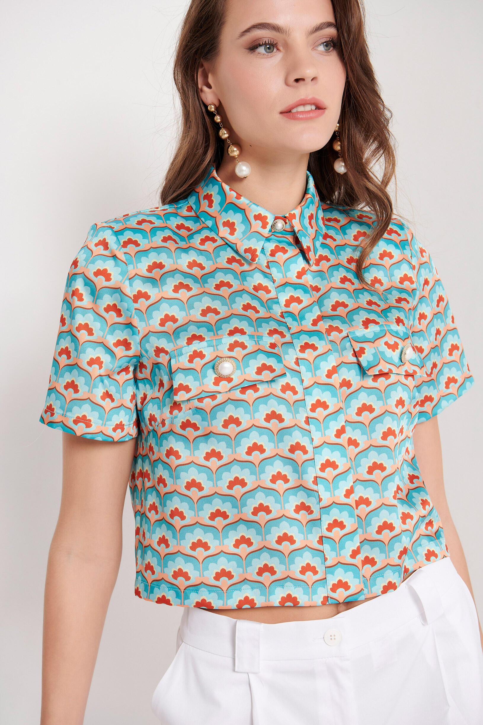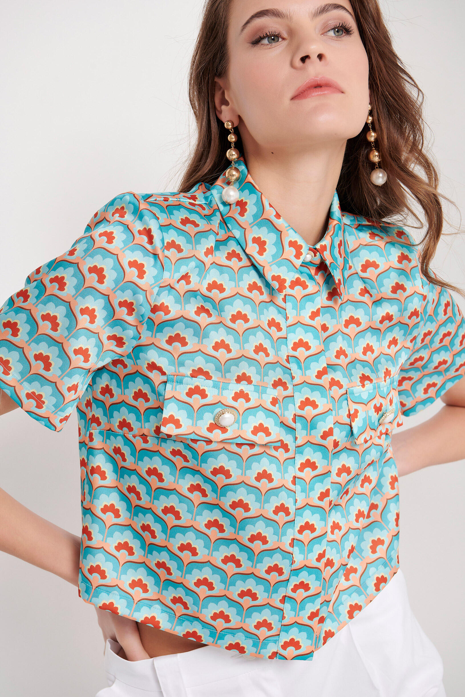 Πουκάμισο cropped εμπριμέ Κωδικός 10-341750-0 Περιγραφή Πουκάμισο εμπριμέ σατέν όψης.Διαθέτει κουμπιά κόσμημα και γιακά.Κλείσιμο μπροστά με κουμπιά. Σύνθεση 100% polyester