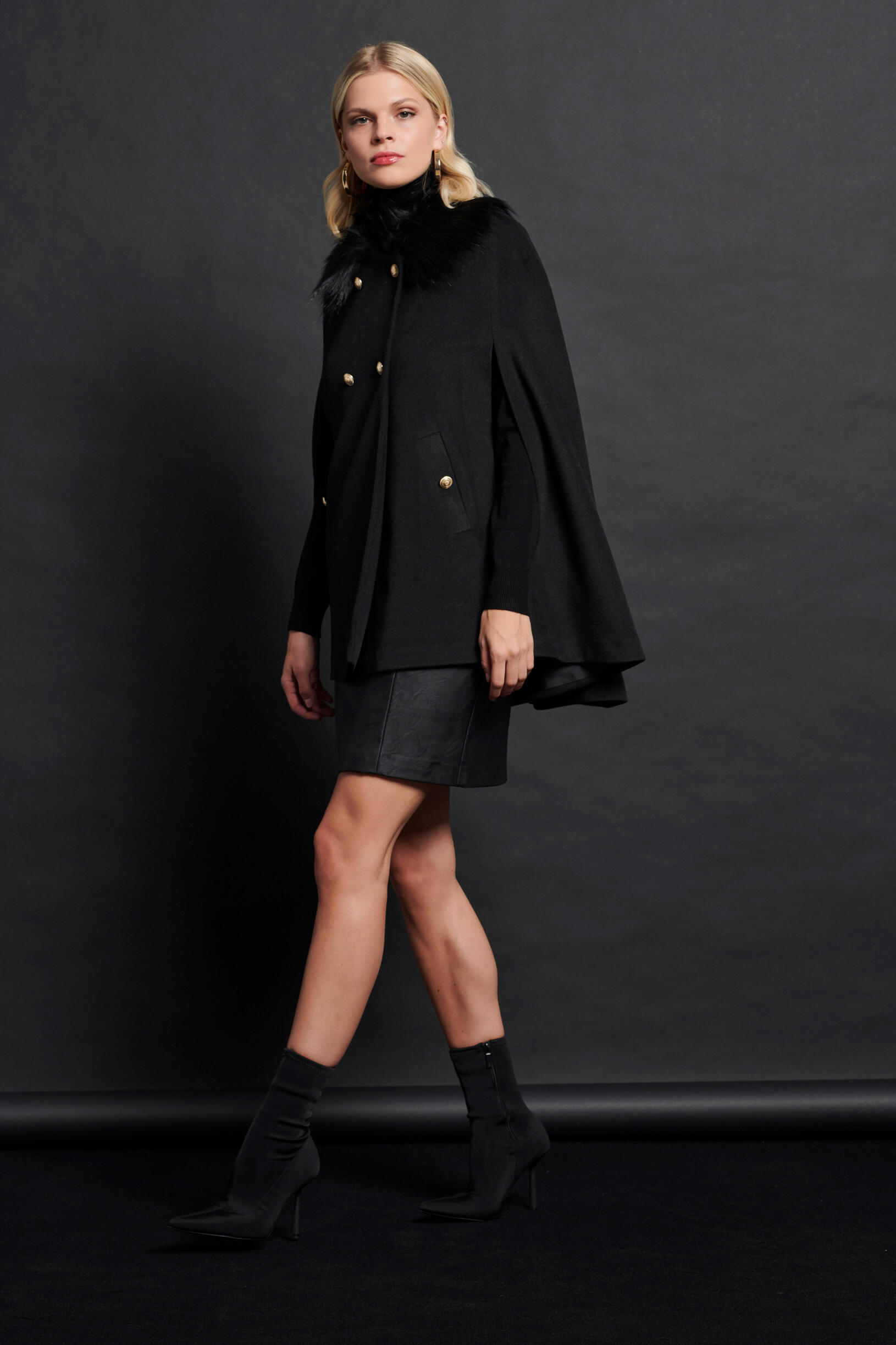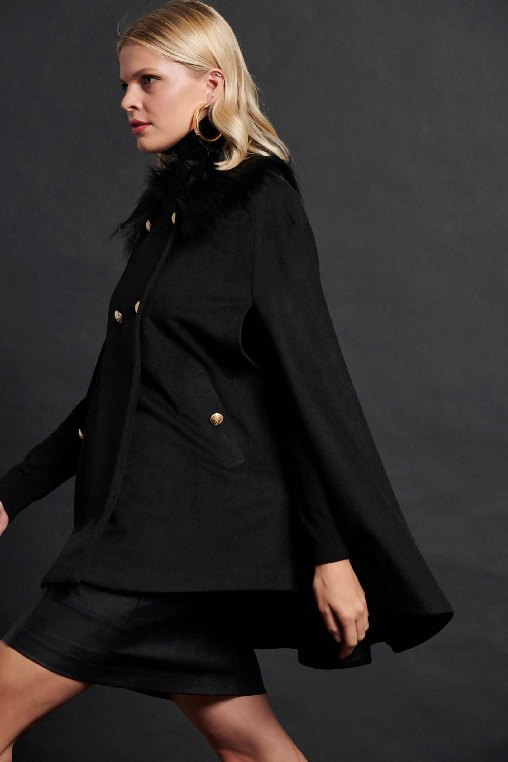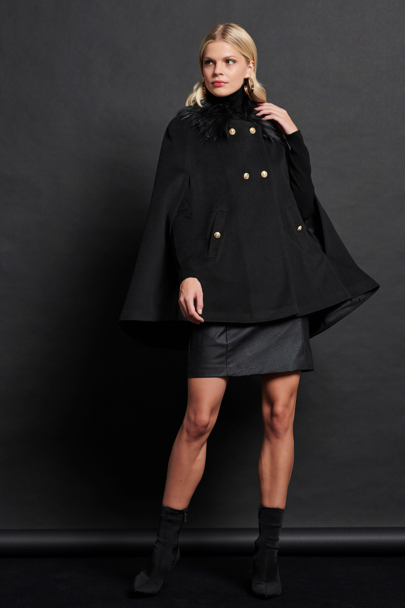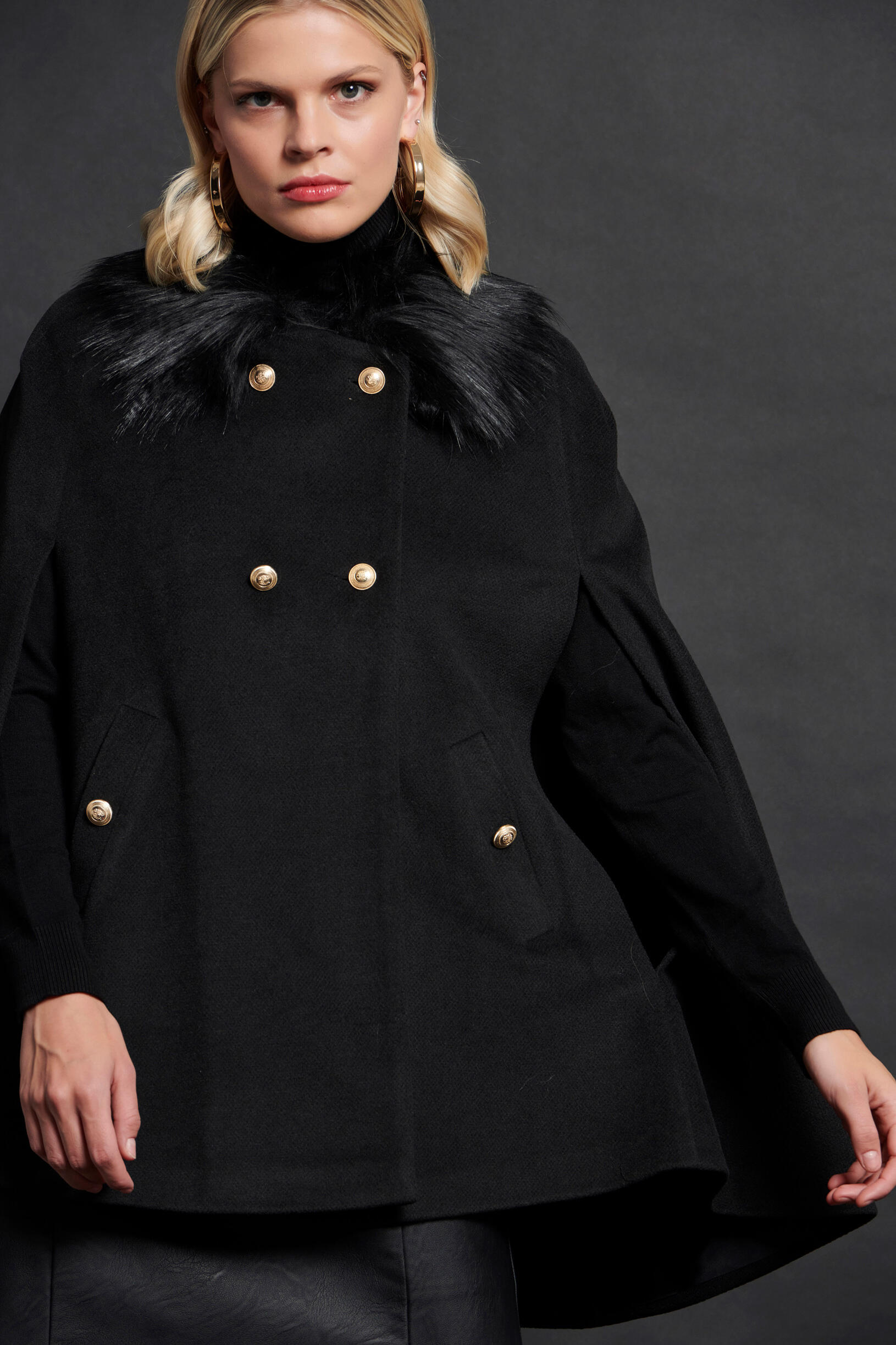 Κάπα με αποσπώμενη οικολογική γούνα Κωδικός 10-090189-0 Περιγραφή Κάπα με χρυσά κουμπιά που κλείνουν μπροστά και πλαϊνές τσέπες. Λεπτομέρεια στο γιακά με αποσπώμενη οικολογική γούνα. Σύνθεση 92% polyester 8% viscose