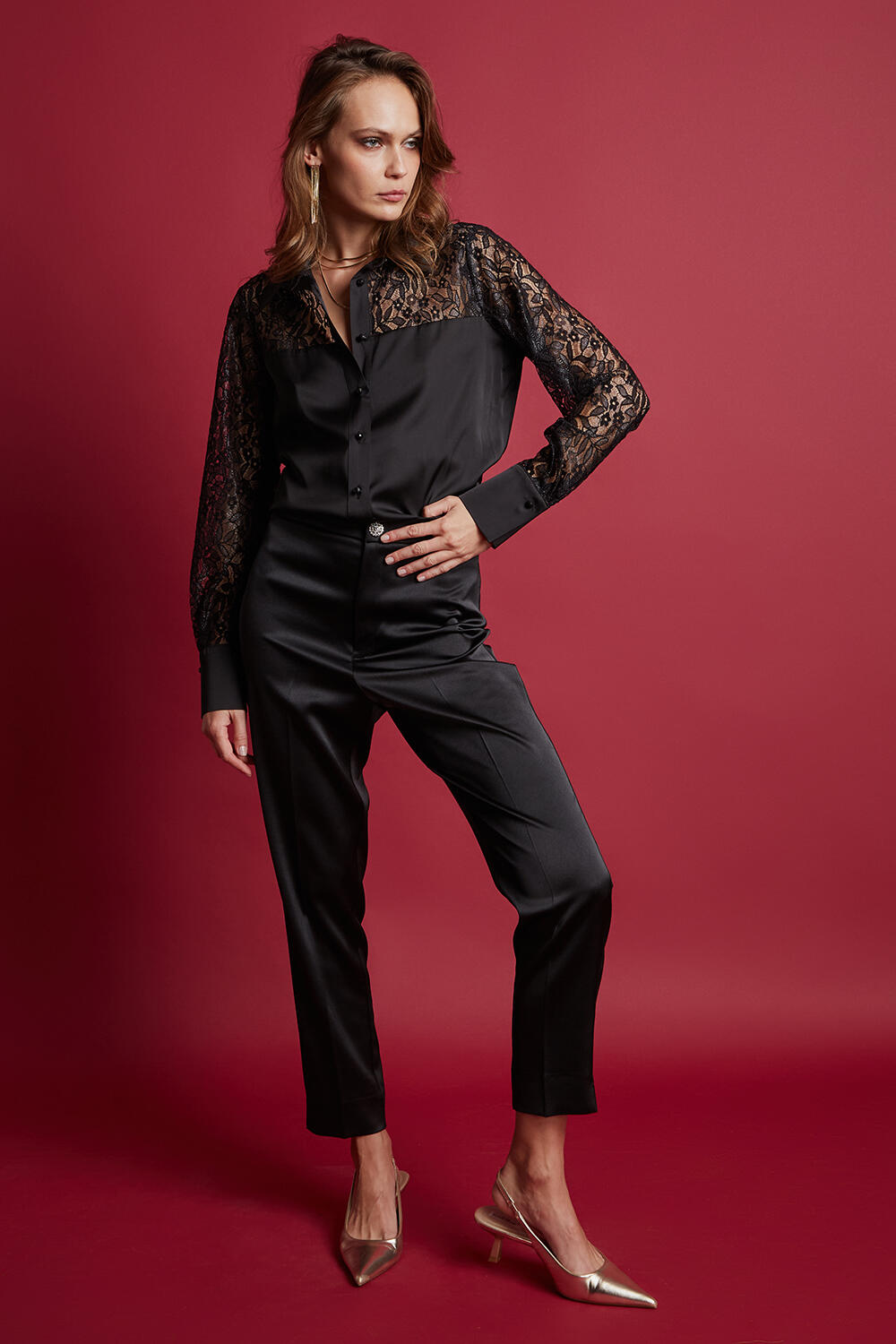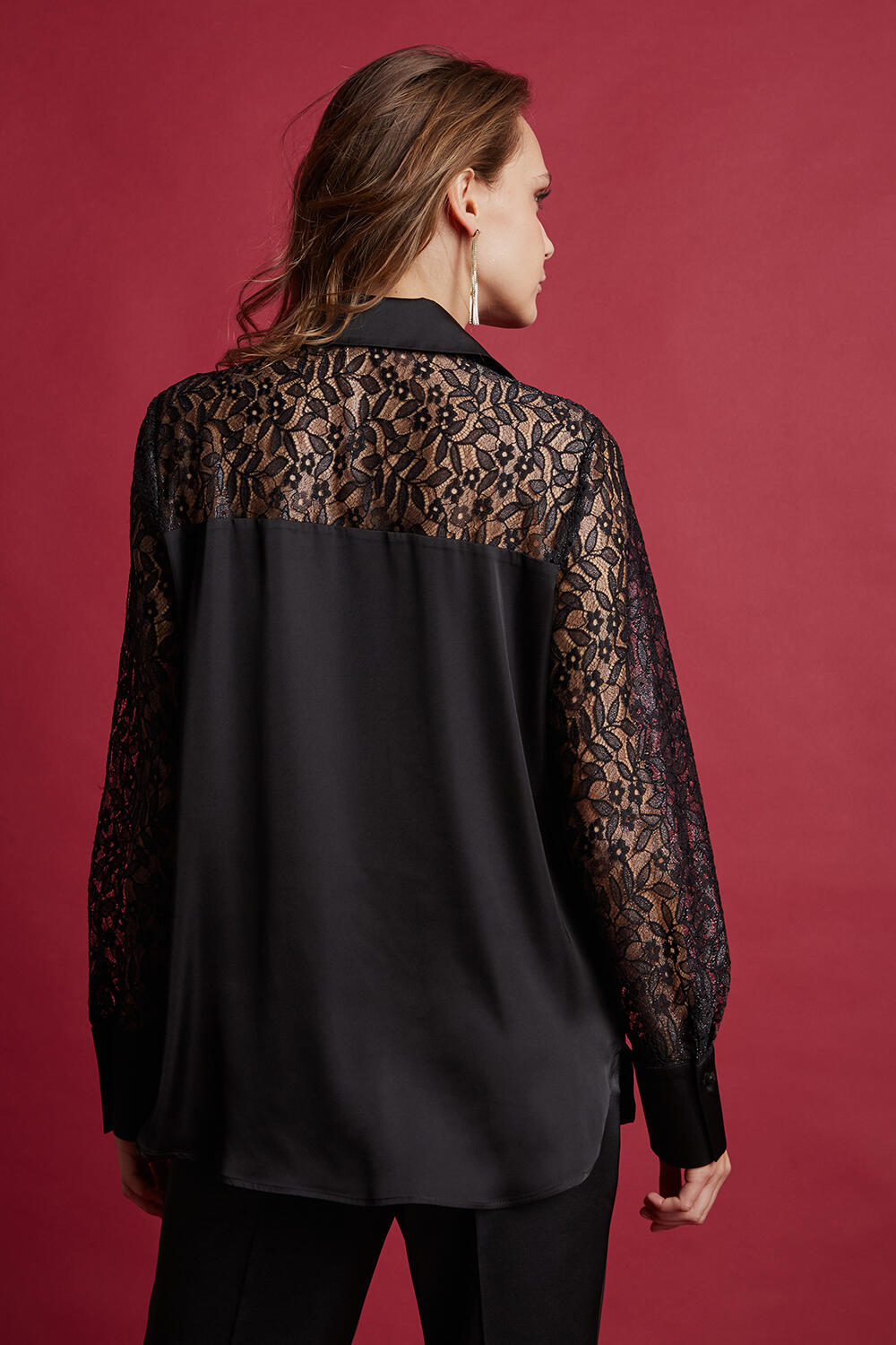 Πουκάμισο σατέν με δαντέλα Κωδικός 10-050432-0 Περιγραφή Πουκάμισο σατινέ με δαντέλα στο πάνω μέρος και γιακά. Κλείσιμο με κουμπιά μπροστά Σύνθεση 95% polyester 5% spandex